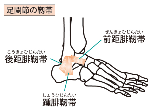 足首は足の部分と脛の部分を結んでいる関節のことで、骨の形状的に内側にねじりやすい構造をしています。それを支えるために足首の外側についているのが、前距腓靭帯、踵腓靭帯、後距腓靭帯という3つの靭帯。