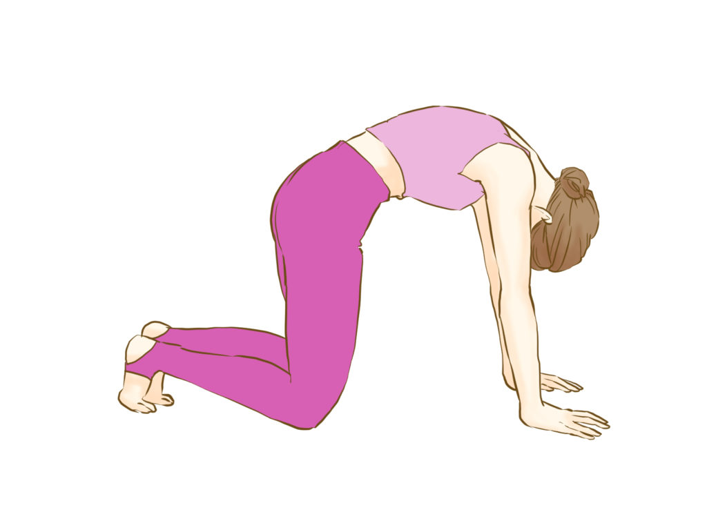 四つん這いになって背中をしっかりと丸める猫のポーズを取ります。このポーズのまま、大きく深呼吸を繰り返しましょう。