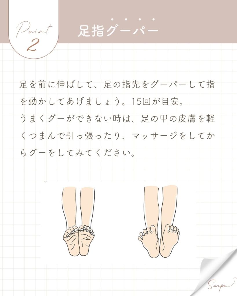 特に足の指は徐々に動きにくくなってくるので、できるだけ意識して動かしてあげるようにしましょう。