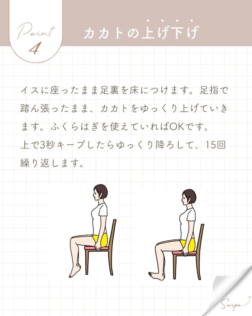 [su_column size="2/3" center="no" class=""]椅子に座ったまま、しっかりと指先で地面を押したままカカトの上げ下げを行います。