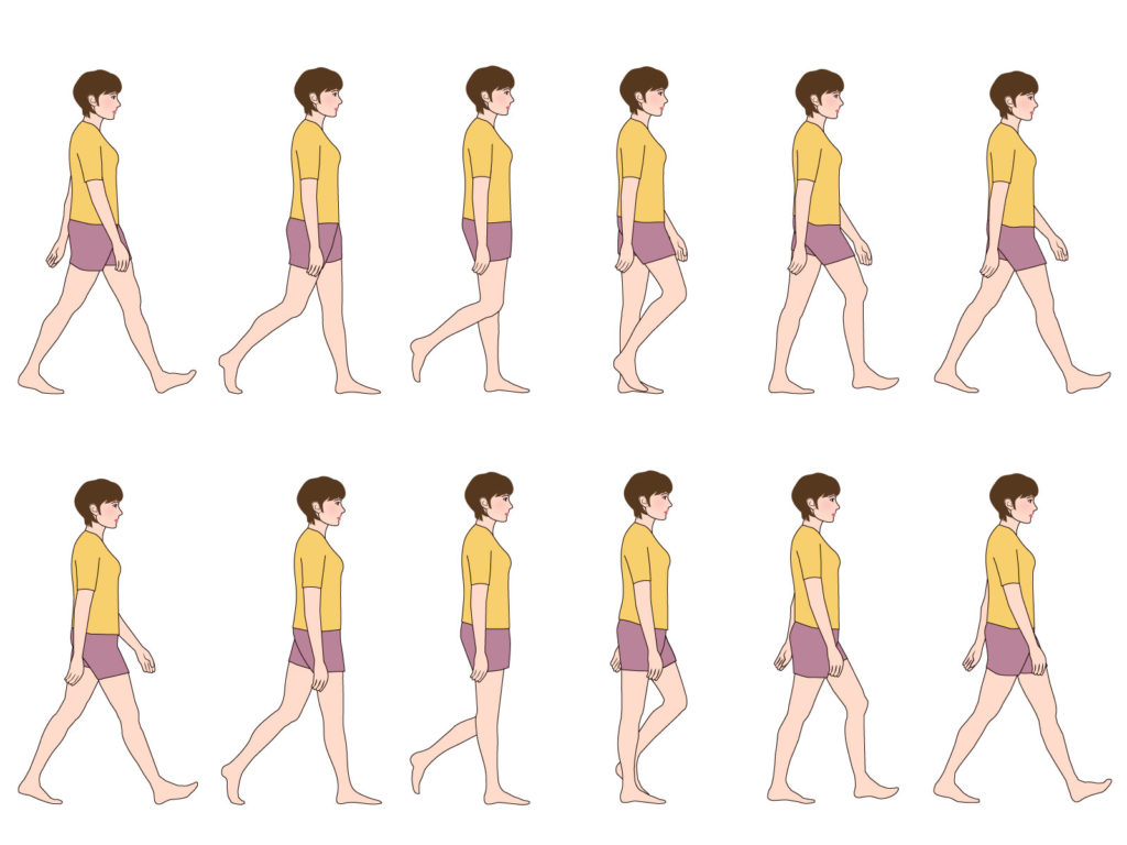 踵から地面に足をついて、足裏が地面を通ってつま先で地面を蹴って前方に進むというのが歩きのメカニズムです。