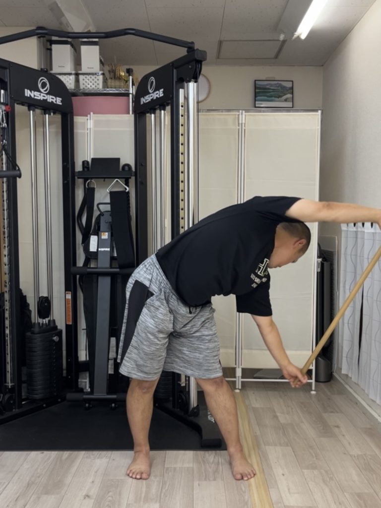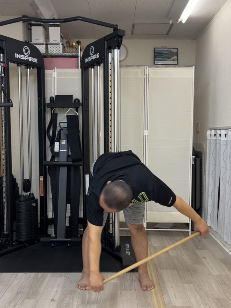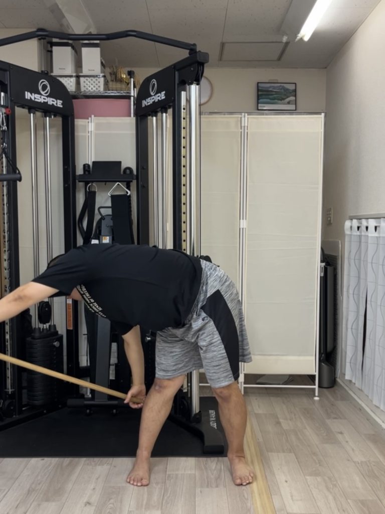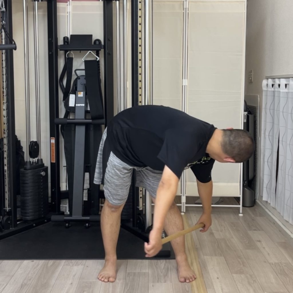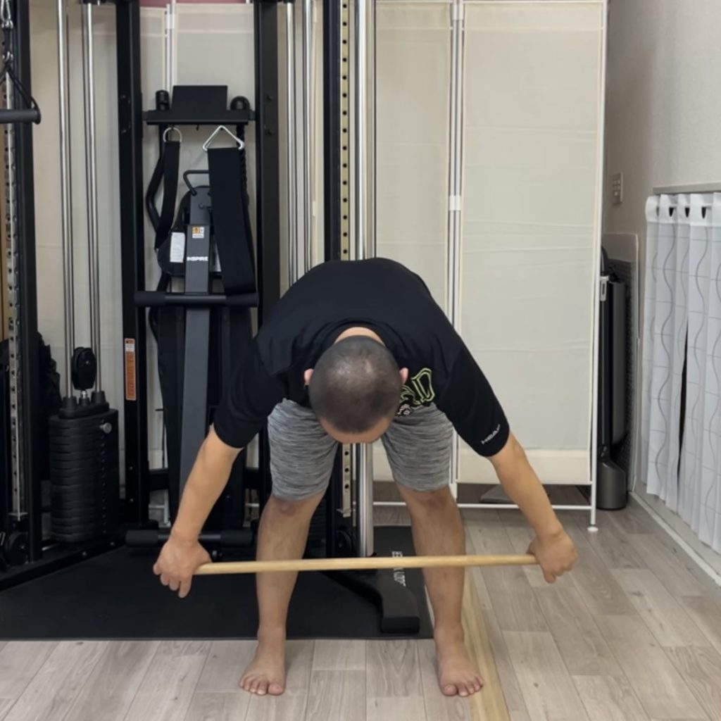 肩幅より広く棒を握って、できるところまで前屈をします。