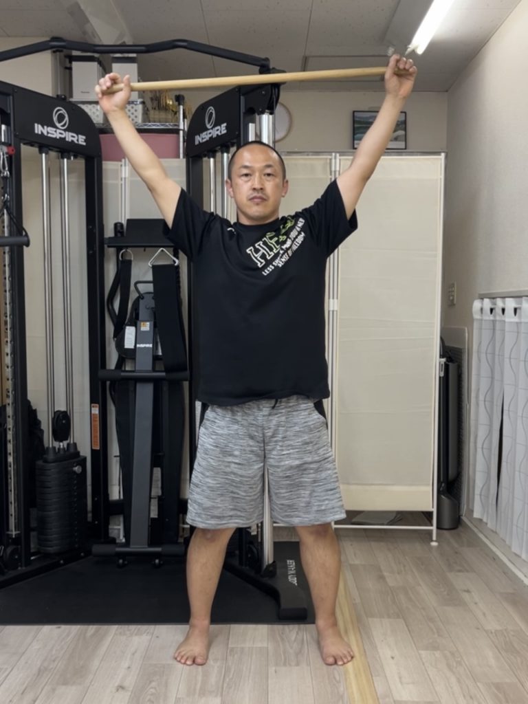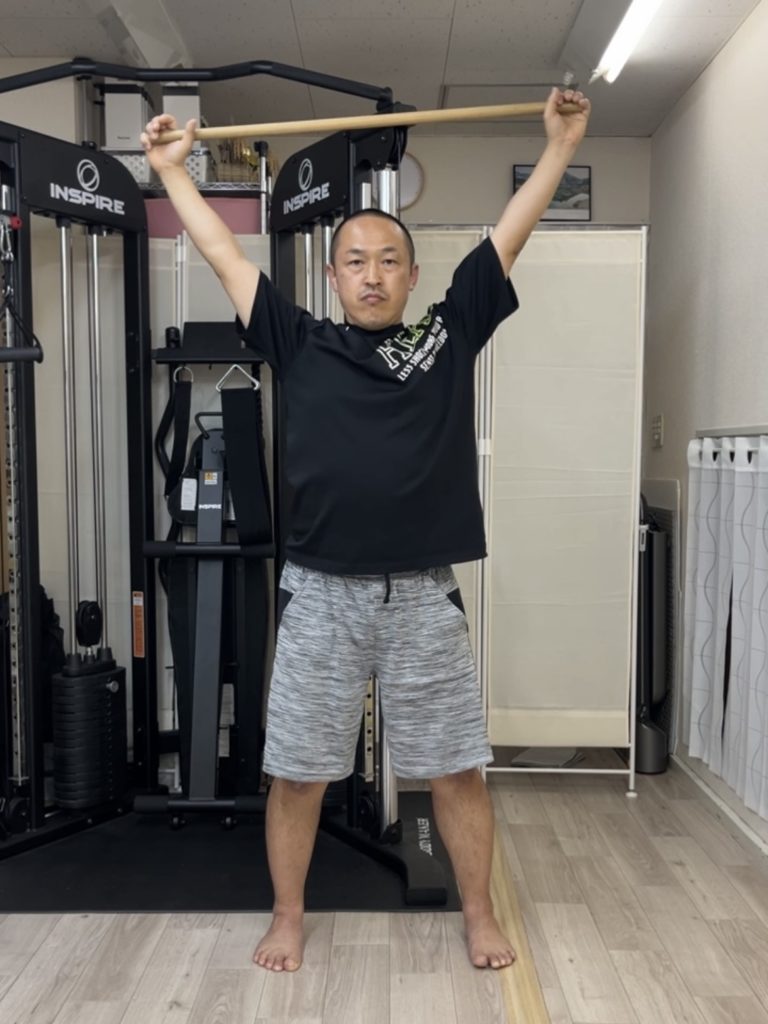 肩幅よりも少し広く棒を持って、頭上にあげます。