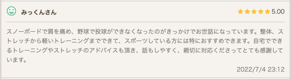 スノーボードで肩を痛め、野球で投球ができなくなったのがきっかけでお世話になっています。整体、ストレッチから軽いトレーニングまでできて、スポーツしている方には特におすすめできます。自宅でできるトレーニングやストレッチのアドバイスも頂き、話もしやすく、親切に対応くださってとても感謝しています。